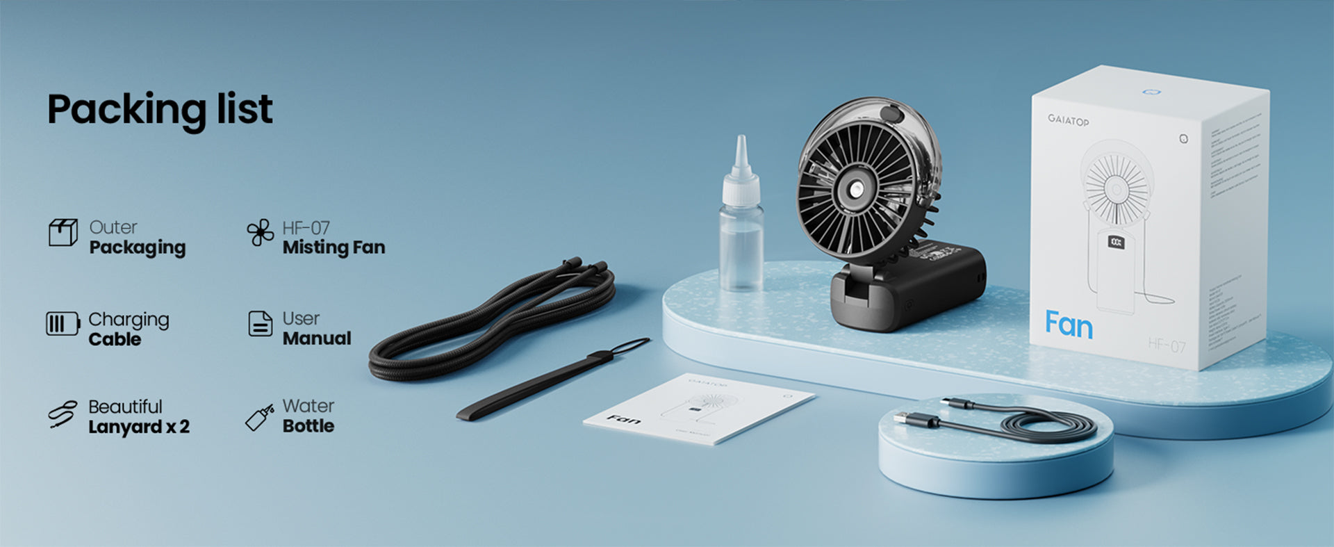 - Dual Function Cooling and Humidifying — Equipped with a 16ml water tank and a handy 20ml refill bottle, this fan offers both strong airflow and fine misting to keep you cool and hydrated. The mist function runs up to 14 minutes per full tank, ideal for dry environments or makeup setting.