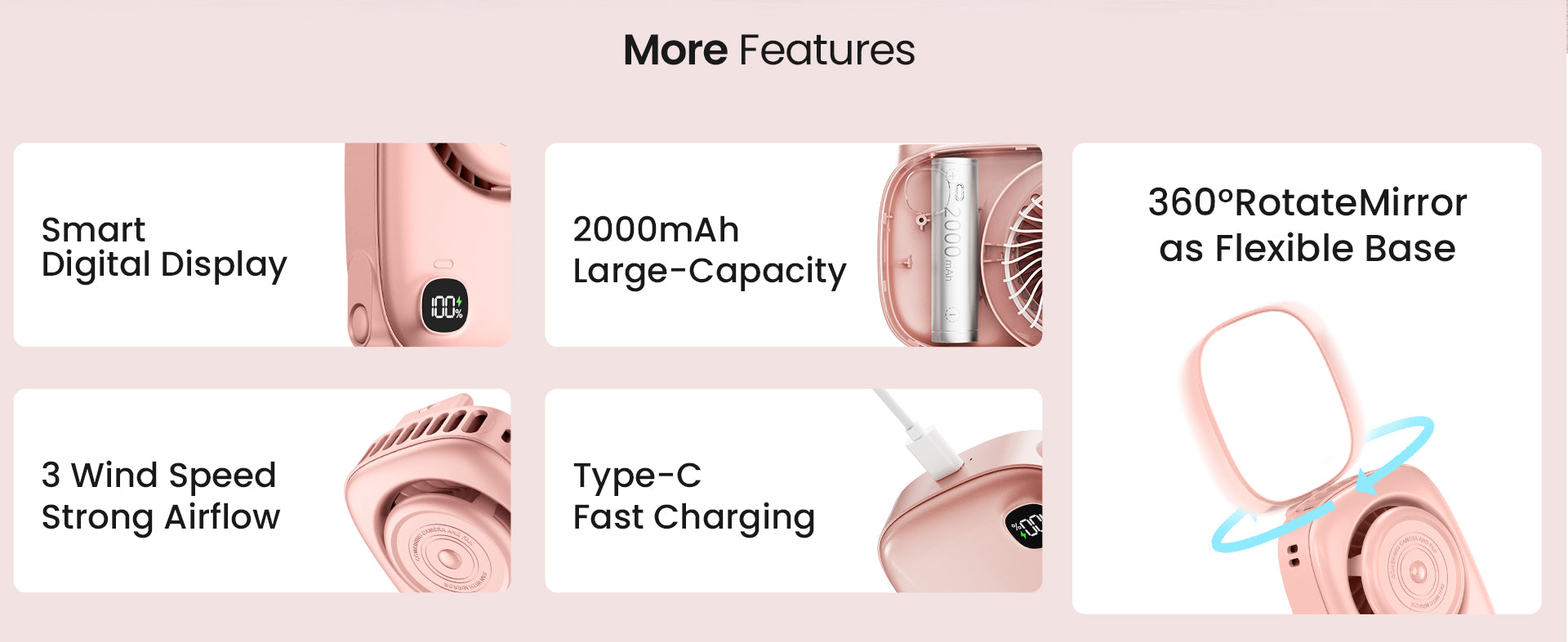 - Multi-Function Small Fan — The portable neck fan with lanyard is lightweight and compact; Makeup fan with 360° Rotate Mirror help fresh up makeup, the bracket makes it as a small desk fan; Mini hand held fan will be a great portable fan beach essentials