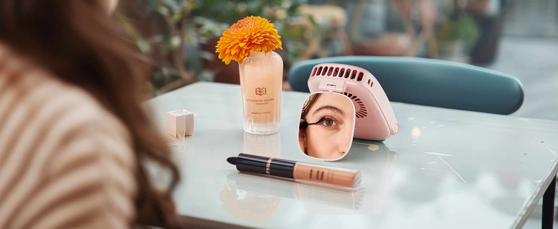 - Desk Fan with 360° Rotate Makeup Mirror — The mini fan is designed with a 1X magnifying mirror, very clear and suitable for the entire face makeup or closeup; The eyelash fan can speed up drying mascara and lash adhesive, really good vacation essentials
