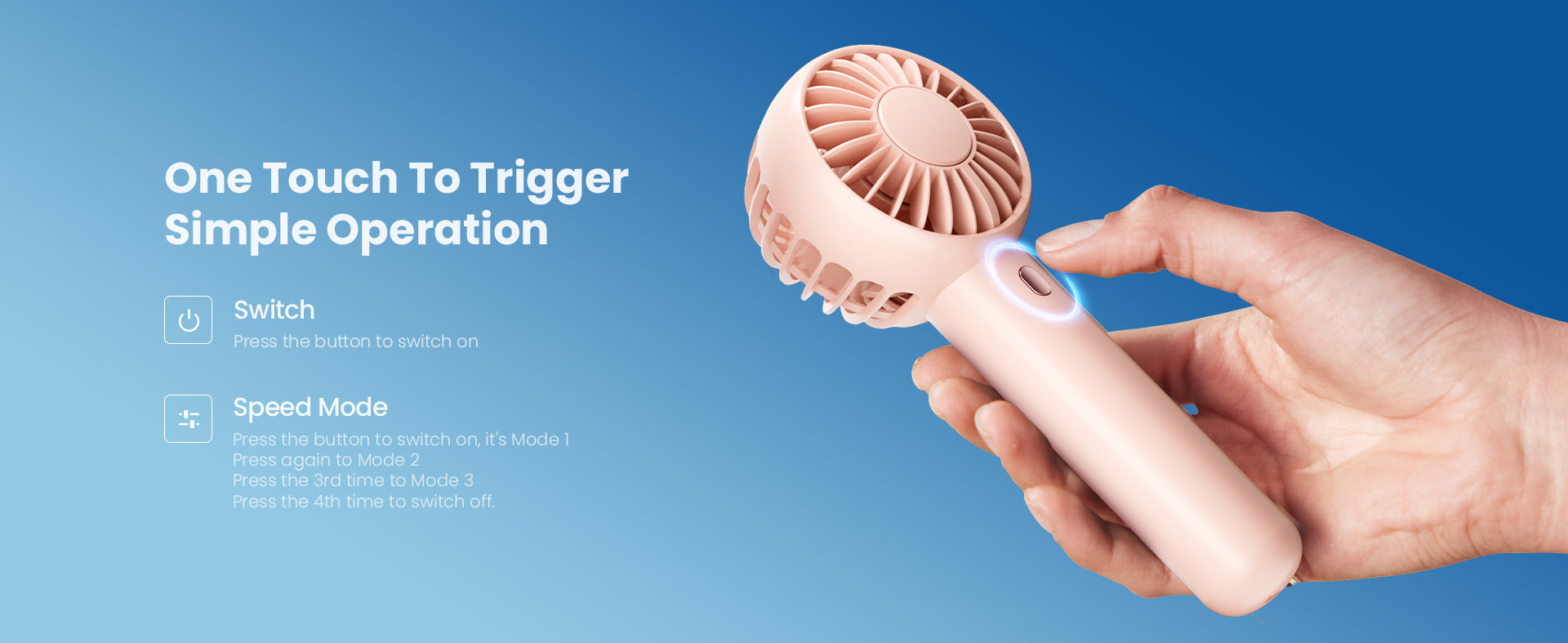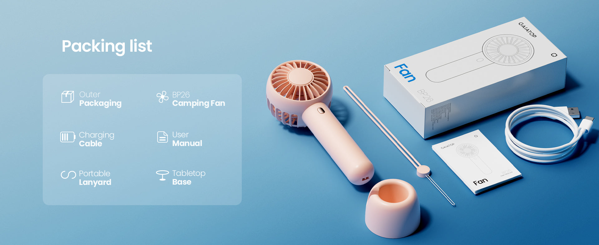 Gaiatop Travel Outdoor Handheld Fan 3-Speed Portable 7Hrs USB-C 98g Lightweight BP26