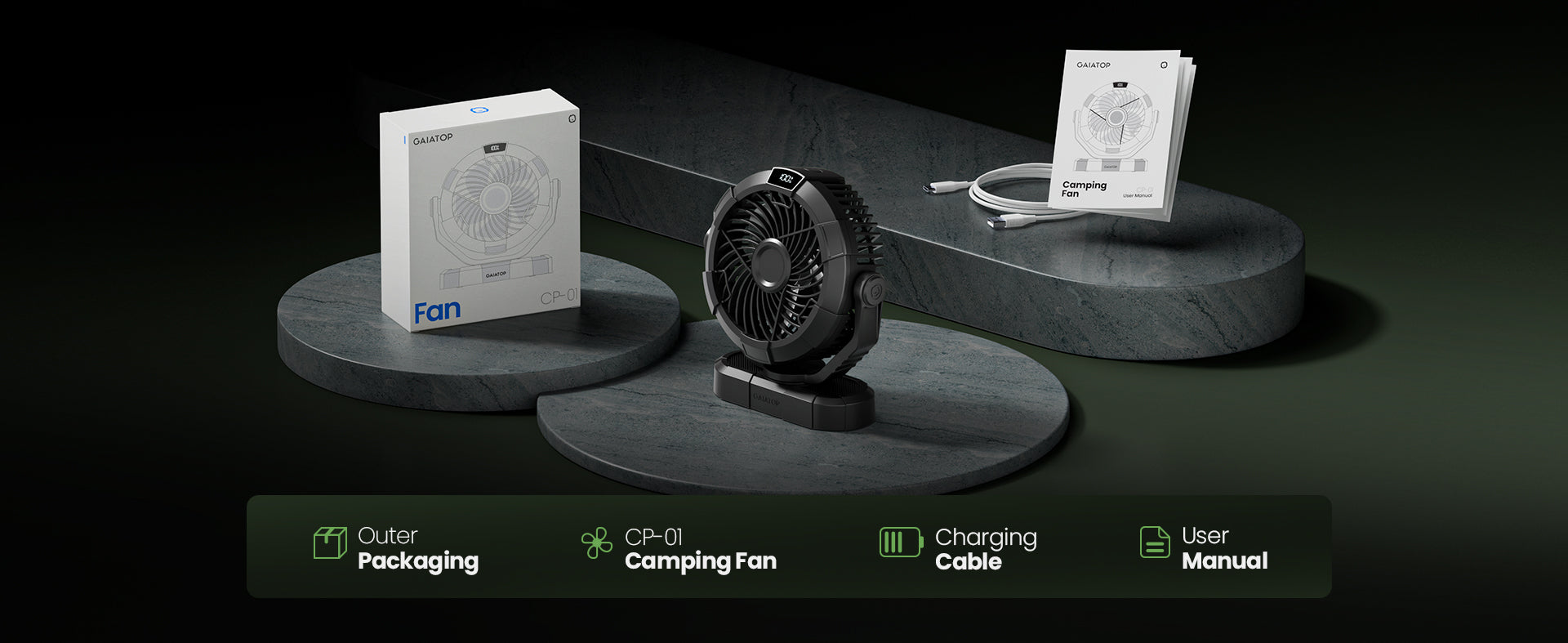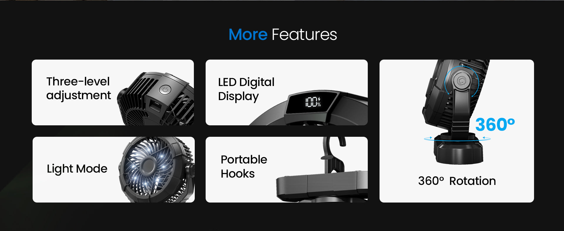 - 360° Rotation & Hook Design — The camping fan supports 360° manual adjustment up, down, left, and right, allowing you to obtain airflow from different directions; The camp fan built-in foldable hook is convenient for hanging, are your travel essentials
