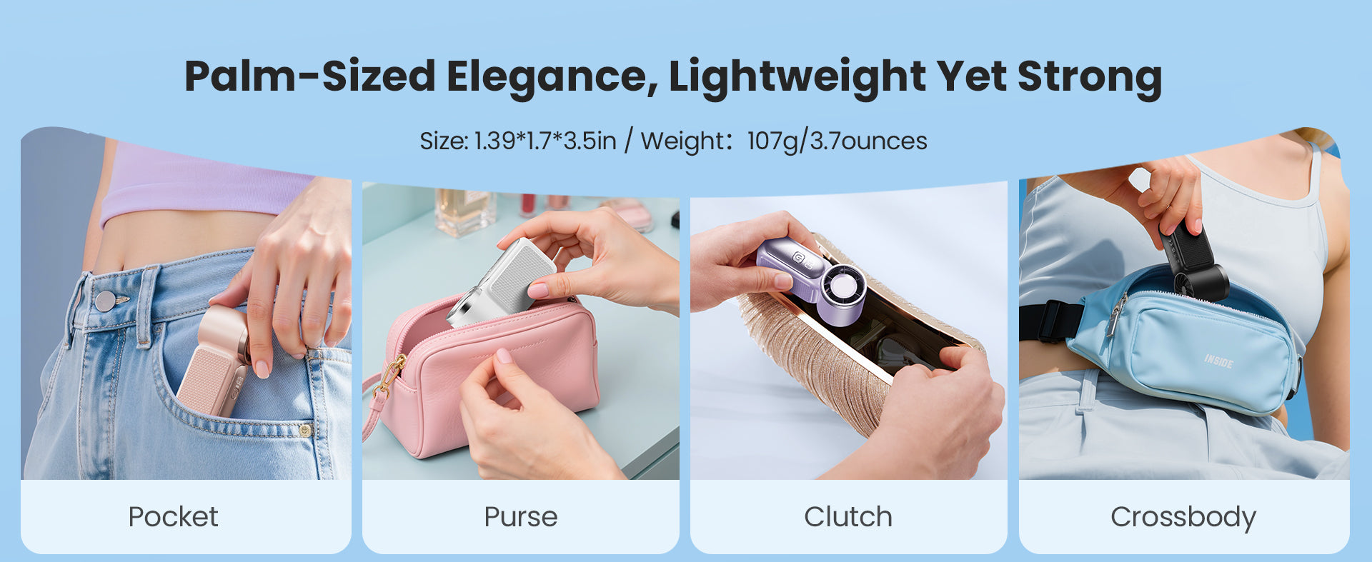 - Pocket-Sized Portability — With its ultra-compact design, this fan easily fits into your purse, clutch, or pocket, making it perfect for cooling on the go.