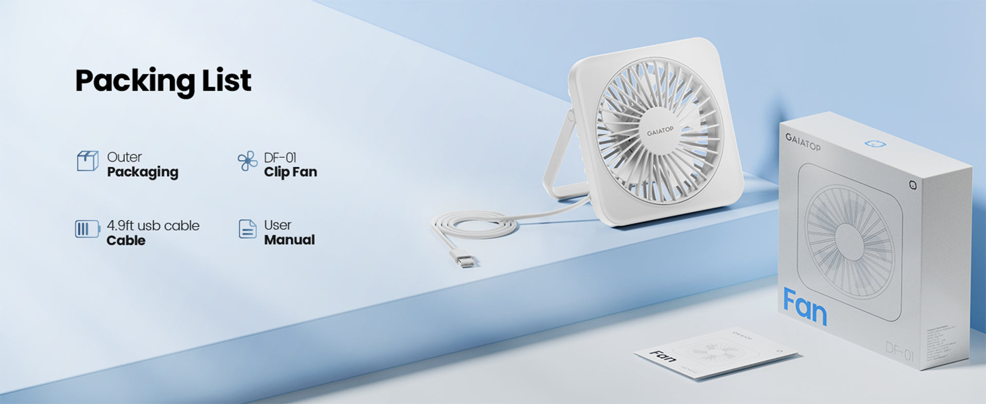 - USB Power, Use Anywhere, Anytime — Powered by a USB connection, the DF-01 comes with a 1.5-meter power cable, allowing you to plug it into your computer, power bank, or any USB-compatible device. Enjoy long-lasting cooling at work or during leisure time, wherever you are.